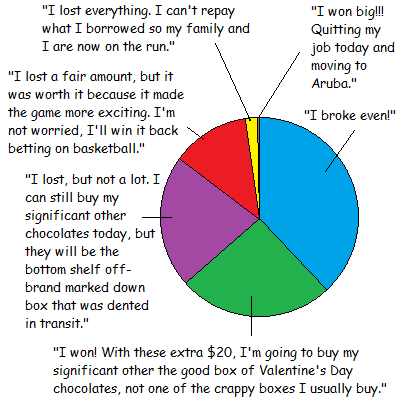 Polls conducted show that the majority of us novice gamblers broke even! Good start, good start. We’re on our way to becoming pros! Soon we’ll be able to retire at 50 and move to Aruba.