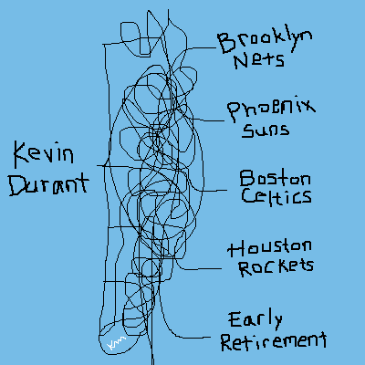 Some books in Vegas are no longer taking bets on where NBA Legend Kevin Durant will be playing some real great bball next year, so now is the perfect time to decide what team you think he’ll be on! You can write it on a piece of paper or just keep it in the ol’ wrinkly skull computer where it’s easy to update as you get more info.