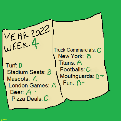 Titans: Everybody! America’s darlings the Tenensee Titsans went on the road all the way to Indiana and they brought back a W for the fans. But most importantly they had fun, which is why the NFL is getting an A in Titans.